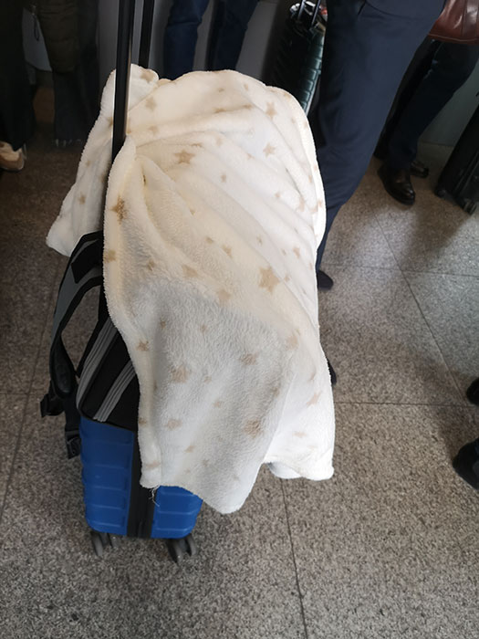 Waiting for the flight was a bit too much for her, so I took out one of the blankets I prepared for the trip and put it over her carrier. She relaxed quickly afterwards.
