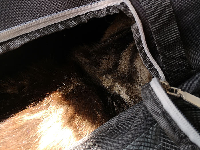 At some point I opened the flap to pet her. She only meowed once, when I showed her the sky and she moved around to face the plane, so I flipped the carrier once again to have access to the flap. At that point she moved around again, to face the plane and meowed to tell me not to flip her carrier again. It was very funny.