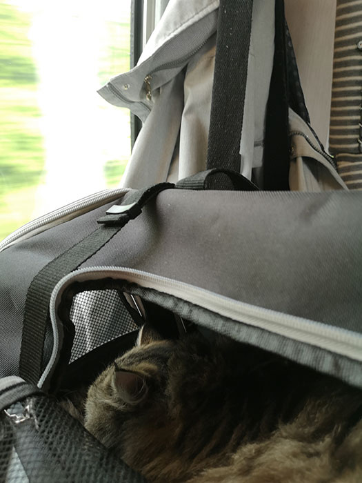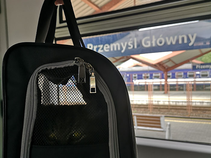 We arrived in Przemysl, Poland. I took this picture while we were waiting at the queue to have our passports checked. She was tired at this point. It didn’t take long to have her documents checked and the border guard didn’t ask us to take her out of her carrier to scan for the microchip, but used the scanner while she was still in her carrier. The microchip’s range was enough to have a good reading of the number.