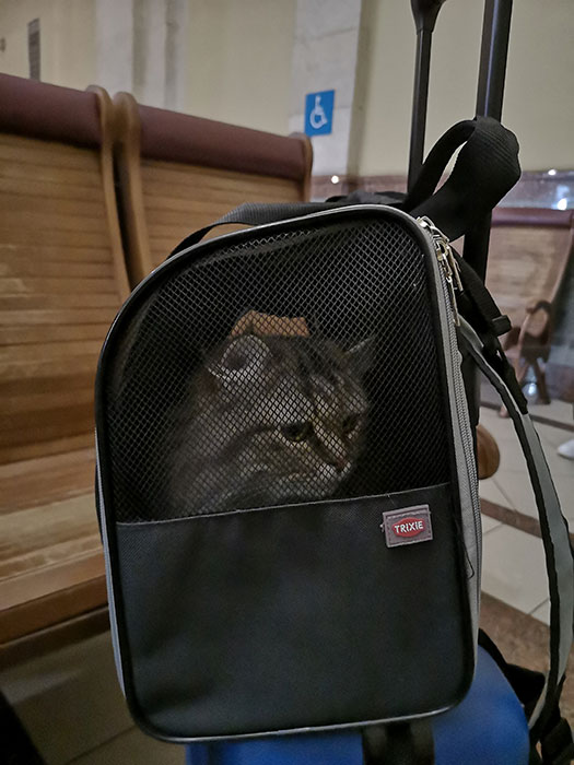 Anyway, I went to a scanner that was on the opposite part of the airport security, the last one. It was a bit quieter as the one on its left was not working at that point. I asked about the procedure and I had to take her out of her carrier. In the end it worked nicely, as she was very well behaved and stood nicely in my arms when we passed through security. We had a couple of people in front and we had to wait. It was funny when I took her out and heard some “awwws” in the back, as people realised that I had a cat in the bag and it was not a regular carry-on backpack.