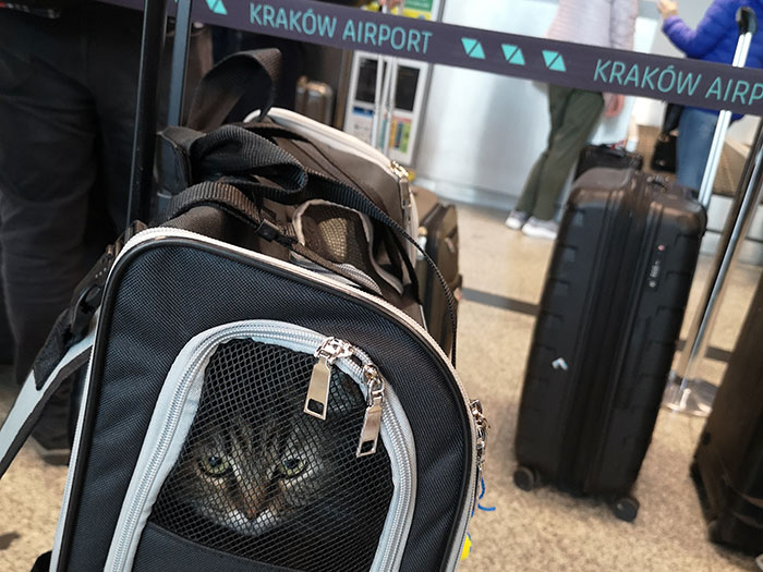 After that we went through security. This is where I can say that I was disappointed with the Polish attitude. It was not the first time I saw an unpleasant and uncaring person in relation to travelling with her. But, this time was different. I saw that there was a special line for security, dedicated to: family with small children, people with disabilities, and… people who needed assistance. That “needed assistance” was vague, so I assumed that I can join that queue, as basically was nobody else after me. It was in a quieter part of security. I was told that it doesn’t matter if I have a cat, that I need to join the queue with the crowd. For me, needing assistance can mean anything, including people who are very afraid of flying and need a bit of extra time. There are airports that offer private rooms for security and anyone can request one. I didn’t join that queue because I was in a hurry and there weren’t many people there, but I joined that queue because I wanted more time.