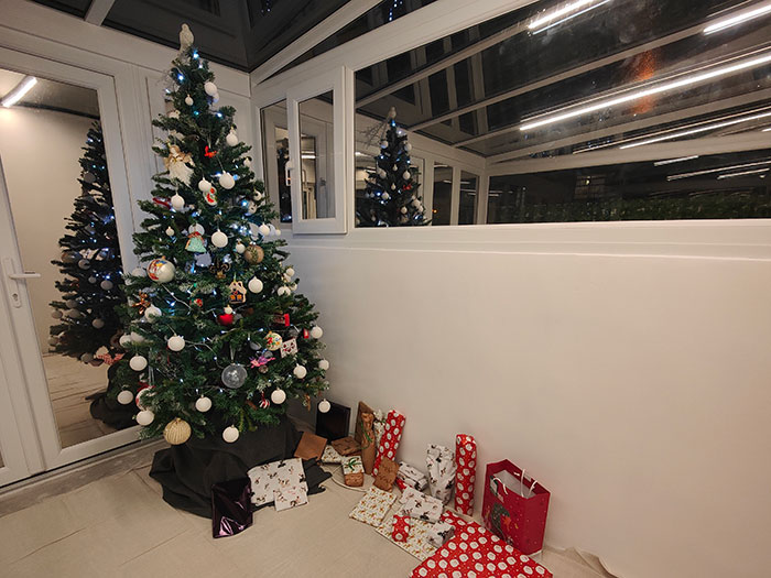 We’ve put the tree in our new conservatory. It looks wonderful there. While the conservatory is not completely finished, we need to wait for a bit until installing the flooring as we have to wait for a month for the self-levelling compound to cure properly.