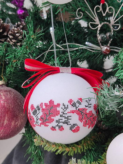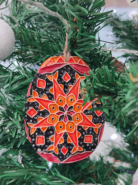 This is another decoration from the veteran market in Ukraine. I loved the look of it. The pattern is similar to a Romanian one, so I had to get it. It is a big bauble, but light.