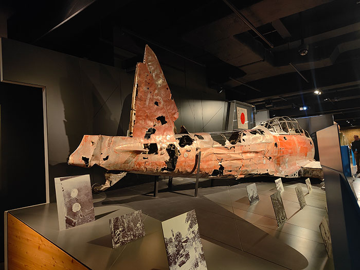Discovered 50 years after WW2 ended, this is the wreck of a Japanese fighter aircraft. A British bullet was found in the metal. It was an aircraft which was repaired several times before it was taken down.