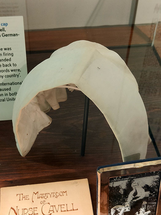 This is the cap of Nurse Edith Cavell, a British nurse who became famous during WW1 because she was executed by the Germans. She treated wounded soldiers from both sides, without any discrimination. She helped about 200 Allied soldiers escape from German-occupied Belgium. I used her photo in an essay a few years ago, so it was really lovely see her cap on display.