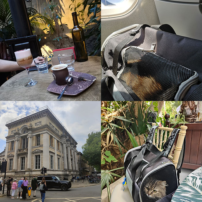 May: My husband and I on a coffee date in Ukraine – Volya and I flying home [technically to Paris, but on our way home to the UK] – Oxford, for setting up the exhibition I organised – Volya at the Palm House, in Liverpool