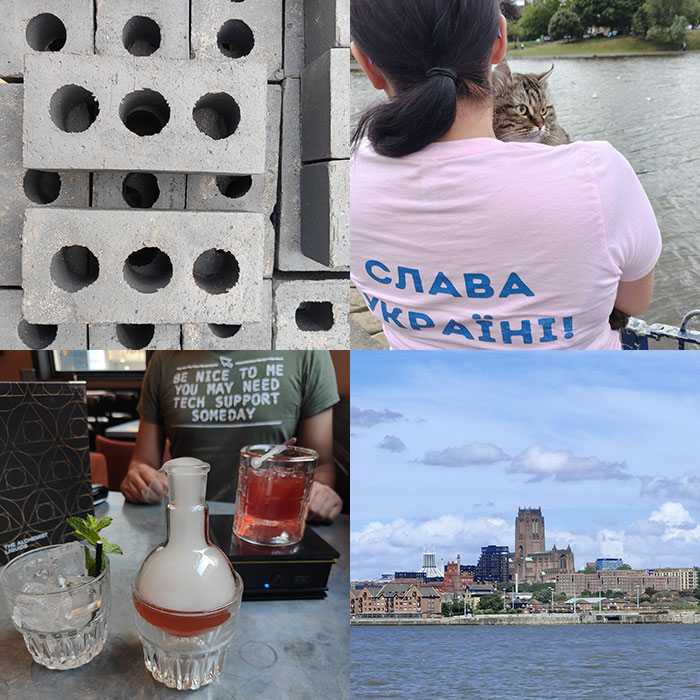 August: Porch renovations started – Volya on a short walk in the park – Cocktails – Liverpool from the river cruise