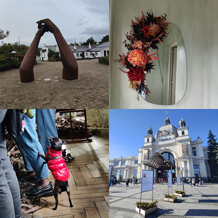 October: Gretna Green – The new mirror in the new porch – Dog at the camo netting place in Lviv, as I was back in Ukraine – Lviv Train station