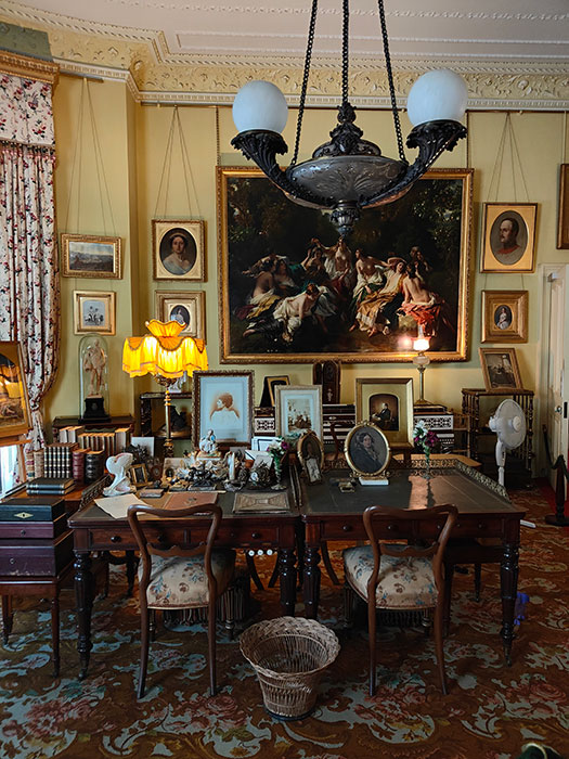 These two desks were used by Queen Victoria and Prince Albert, side by side. After his death, the bell to summon the servants from his desk was removed, but the desk remained in place. How wonderfully sad is this story? She loved him so much. Also, I was surprised to see how small these desks are. My desk is bigger than this.